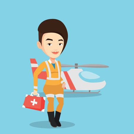 空気の救急車のアジアの医師 救助ヘリの前に空気救急車立っての若い医者 ドクターヘリは 救急箱を持っての医者 ベクトル フラットなデザイン イラスト 正方形のレイアウト のイラスト素材 ベクタ Image